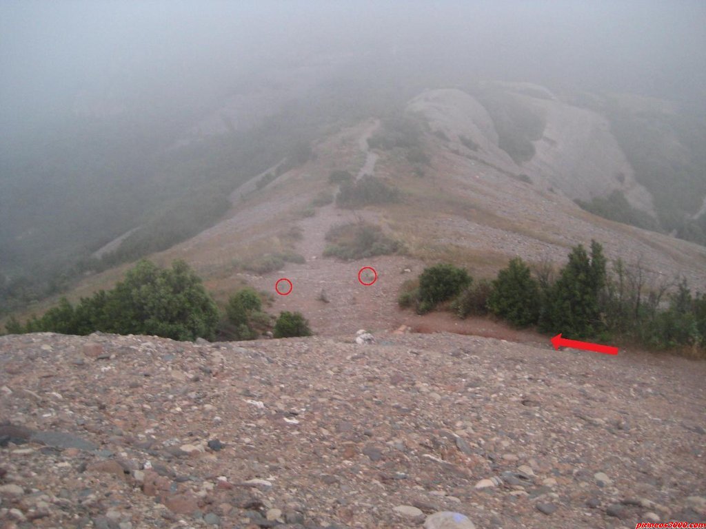 FOTO 17: Camí cap al Coll d Eres (Sud-Est). Els cercles vermells indiquen les estaques metàliques de color verd que indi...