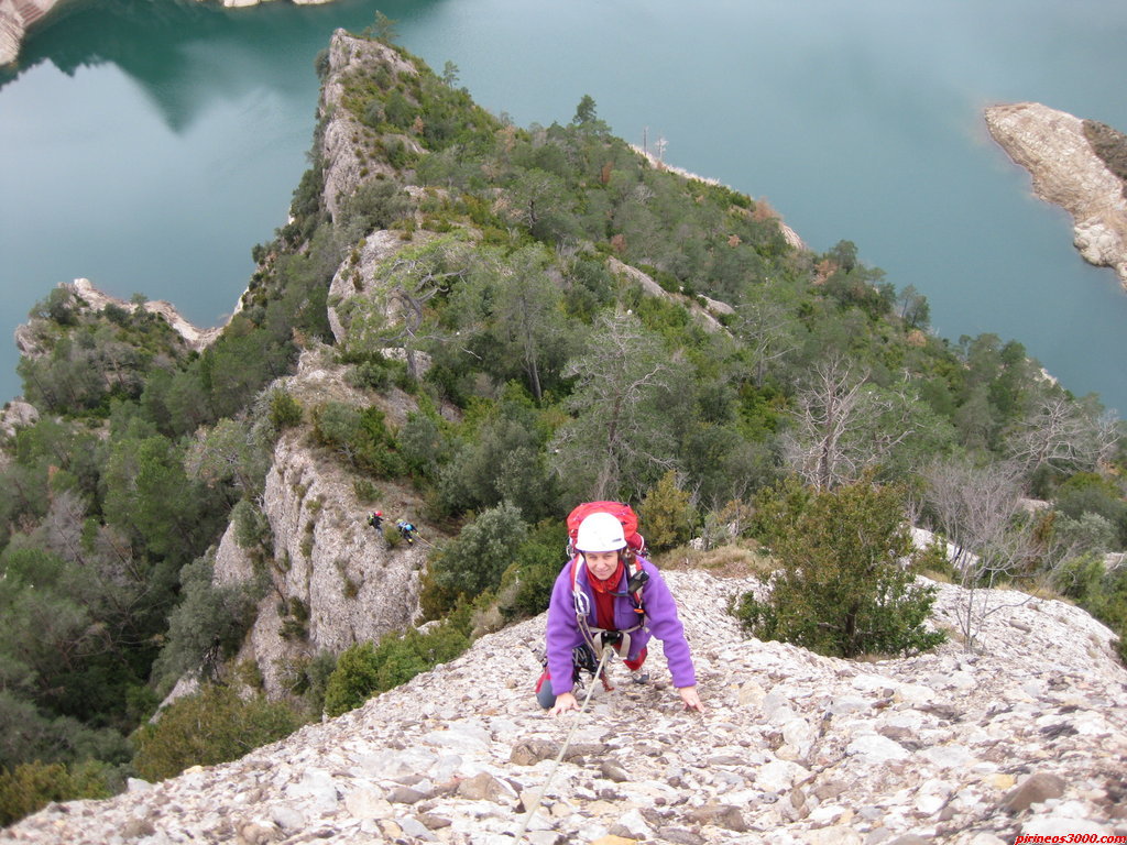 El primer tramo se hace caminando y grimpando algunos pasos de IIº,buscando siempre la arista para salvar las zonas de arbustos,hasta llegar a la,previamente vista,pared.