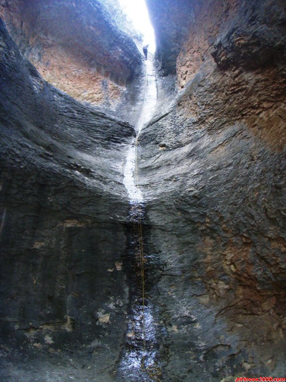 - Equipamiento de la vía: Bien equipado. 2 cuerdas de 50 minimo, mas otra auxiliar si es posible tambien de 50m. ademas del material habitual para descenso. si lo pillamos con agua, agüita. Seco, no es necesario neopreno