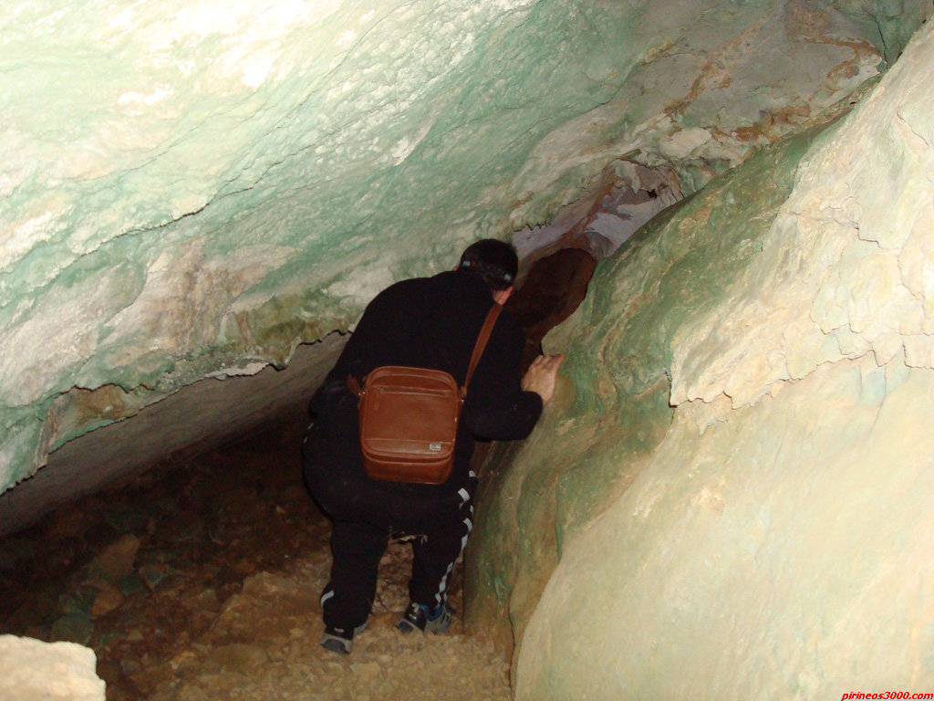 - Una vez realizado el fácil destrepe, a ambos lados se abre una galería. Primeramente seguimos la galería de la derecha, por la que vamos descendiendo ligeramente y por la que podemos observar sobre nuestras cabezas un par de murciélagos descansando placidamente, pero que al notar nuestra presencia huyen hacia la otra galería. La galería se va estrechando y nos obliga a avanzar agachados, y por donde observamos alguna pequeña pero bonita columna, para en breve llegar a un estrecho paso, el cual rebasamos arrastrándonos unos escasos metros, llegando así, al final de la galería, donde se encuentran unas bonitas coladas.