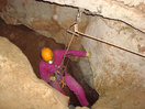 - El pozo se halla equipado con un par de reuniones, así que tras la instalación de la escala y la reunión, rapelamos el mismo y nos deposita en un pequeño rellano, donde nos despojamos de los arneses, pues ya no los emplearemos hasta que no nos toque remontar el pozo.