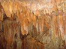 - Tras una sesión fotográfica, seguimos adelante pasando entre las columnas que forman la Cárcel, apareciendo ante nosotros unas apiñadas estalactitas y unas grandiosas y espectaculares columnas que llaman nuestra atención y por una amplia galería vamos superando algún pequeño resalte arcilloso y resbaladizo, llegando así, a unas notorias formaciones estalactíticas denominadas Los Órganos, que al golpear suavemente sobre ellas, emiten diferentes sonidos.