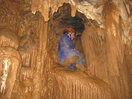- Un nuevo sinfín de estalactitas y columnas nos vuelven a sorprender y tras superar un pequeño conducto y una rampa que superamos sentados, ante el resbaladizo terreno, alcanzamos una bella y concrecionada sala, donde un resbaladizo resalte de 3 metros aparece ante nosotros, y el cual superamos mediante una trepada, alcanzando tras el, un estrecho y angosto conducto llamado Paso de la Bellota.
