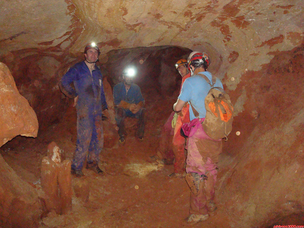 - Primeramente avanzamos entre unas altas y húmedas columnas, para poco después llegar a un circular conducto, el cual superamos mediante una arrastrada, saliendo así, a una zona donde la galería toma mayores dimensiones, que nos permite seguir de pie por un rojizo suelo de barro, llegando poco después al final de la misma.