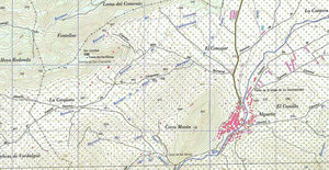 - Con el convento y el pico San Cristóbal al frente, avanzamos unos 200 m. y alcanzamos un quinto cruce, que seguimos hacia la izquierda, ahora por pista asfaltada durante otros 200 m. aproximadamente, donde un nuevo poste indicativo nos invita a abandonar la asfaltada pista que se dirige a una antigua mina de plata y siguiendo hacia la derecha, ahora por pista de tierra, nos elevamos cómodamente y tras algunas lazadas, alcanzamos una herbosa explanada, donde se ubican los restos del Convento de San Cristóbal, punto donde se inicia la singular ruta botánica del convento de Alpartir.