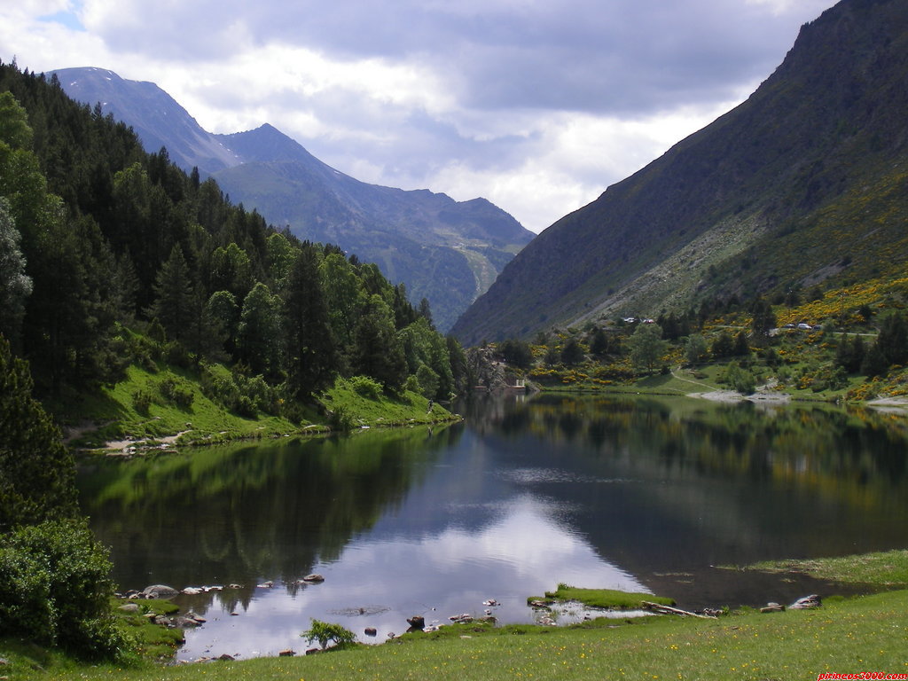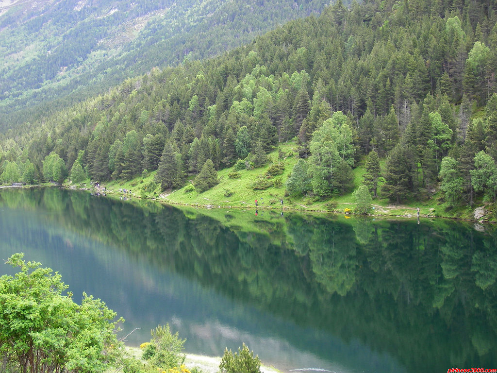 Tras unos 20 min de seguir el GR el camino cambia radicalmente de dirección hacia el N para dejarnos ver el precioso valle que se abra ante nosotros ahora. Son las 12:10h y estamos a 2.170m. Como puntos destacables observamos como tímidamente el Pico del Castell Isard (2.633m) asoma su cima por encima del enorme muro de la Presa de Lanós, bajo ésta, se observa perfectamente el terreno removido de una antigua mina a cielo abierto, ahora reforestado (1 punto a favor de los franceses, a ver si nosotros tomamos nota de esto).