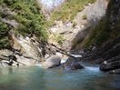 El barranco ligeramente represado tiene un cauce de aguas profundadas y rápidas y unas angostas paredes muy húmedas. Se trata de un tramo espectacular pero lo que nos preocupa es la humedad del terreno, especialmente el principio del tramo en el que los pies han de asegurarse en unas lajas bastante lisas e inclinadas hacia el cauce.